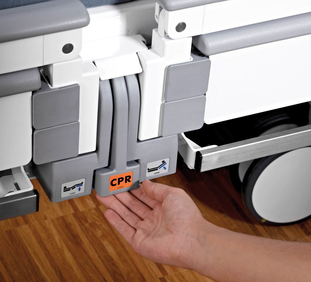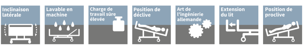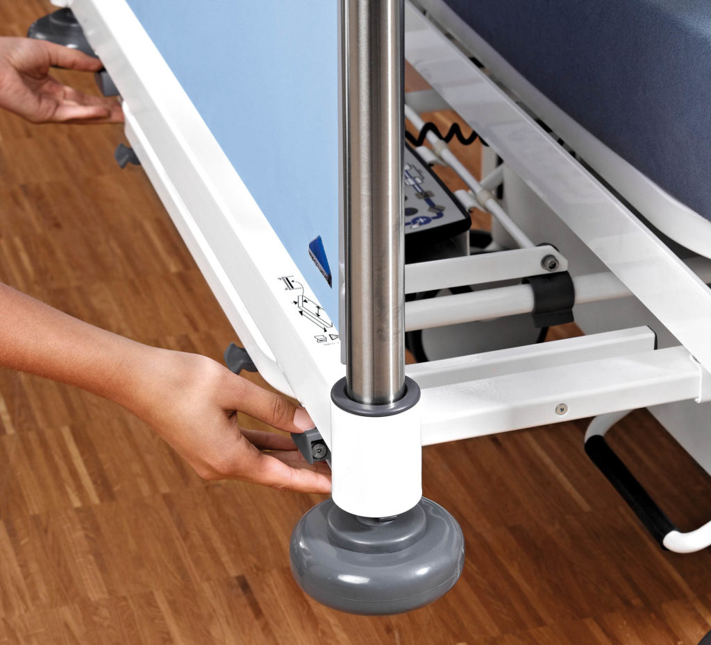 FLEXIBILITÉ – avec des rails universels en acier inoxydable sur les côtés et 4 réceptacles pour les supports de perfusion ou la potence, le lit permet des soins médicaux individuels.