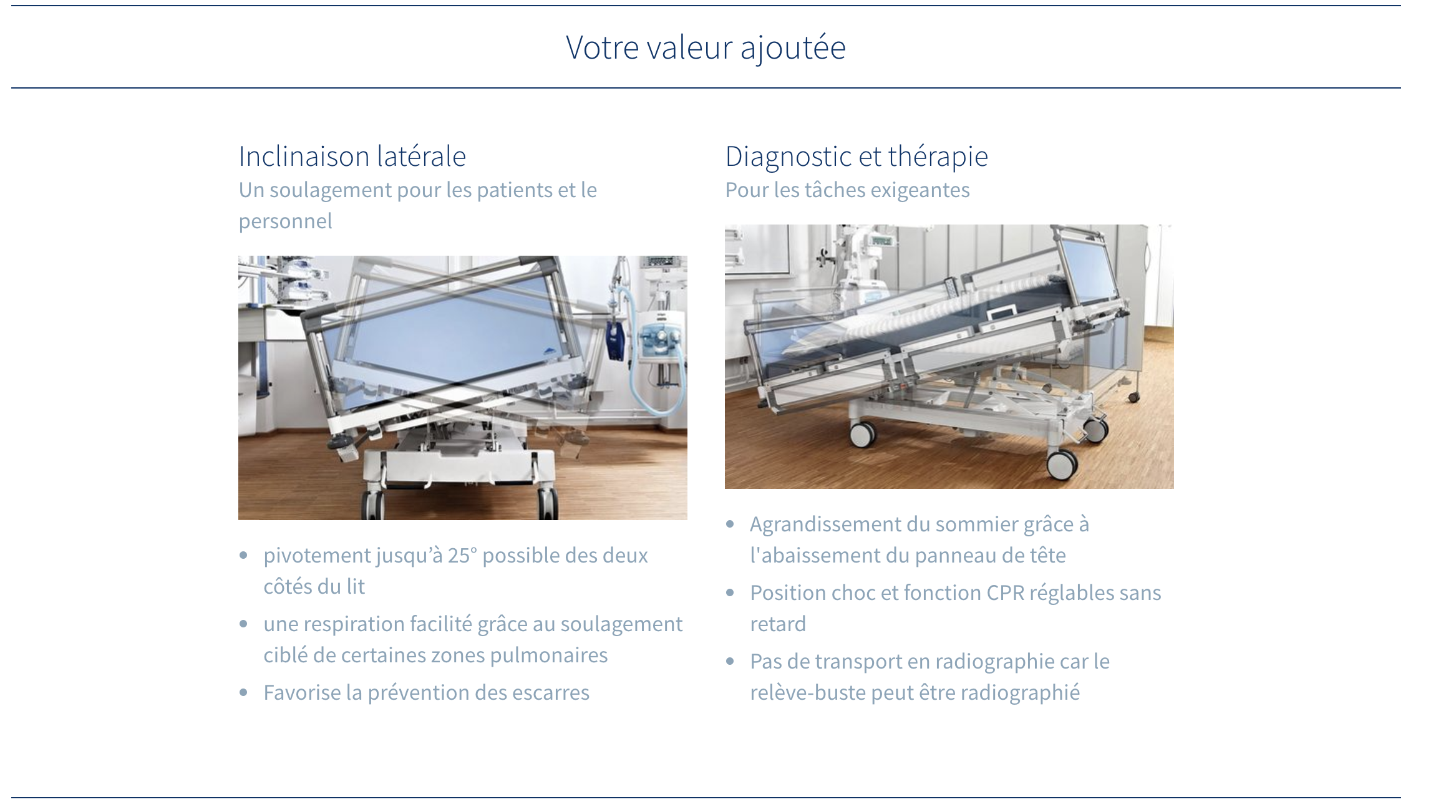Le Sicuro pesa à pivotement latéral aide le personnel des soins intensifs pour les soins et les changements de position des patients. Il favorise une guérison rapide et contribue à un travail économique dans le service. Les patients profitent d’un confort élevé et d’une protection optimale.