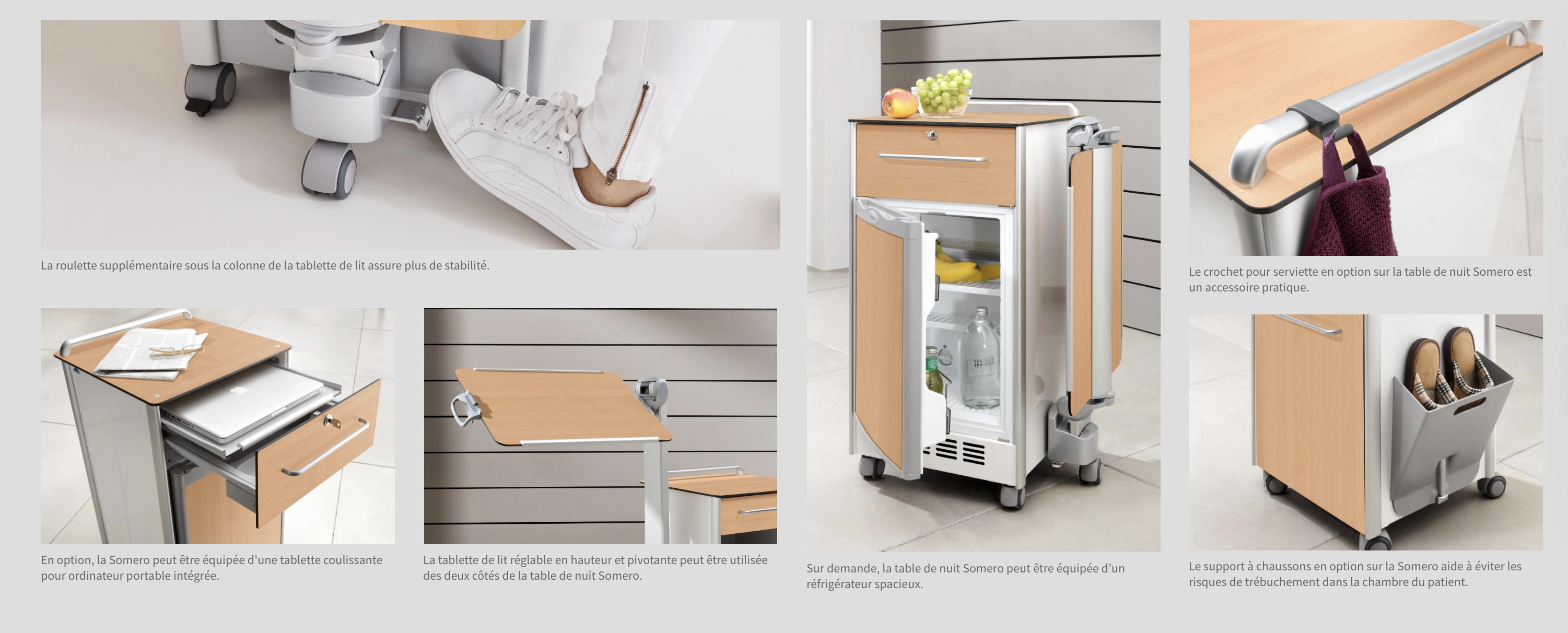 La tablette de lit réglable en hauteur de la Somero peut être déplacée du côté droit au côté gauche en quelques manipulations. Cela permet d’utiliser la table de nuit partout dans la pièce.