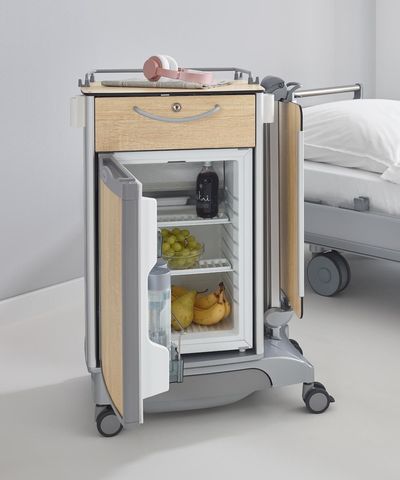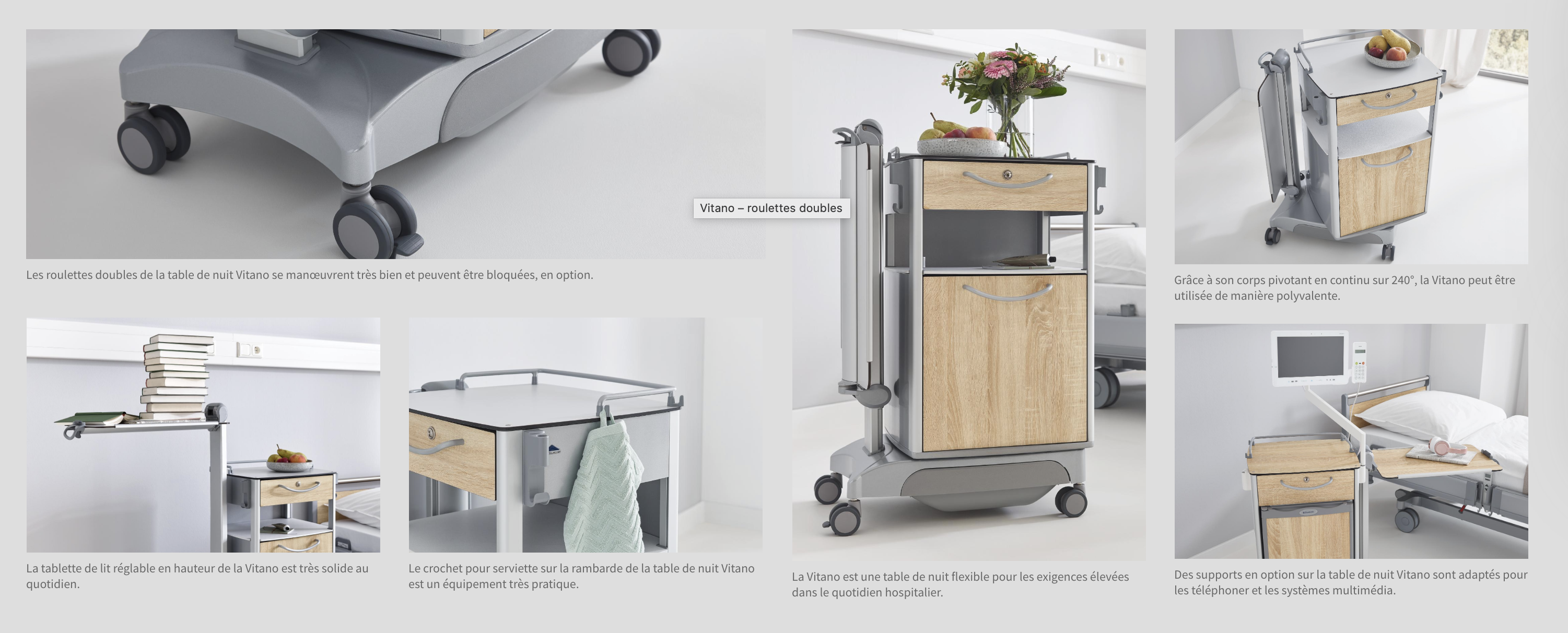 La belle table de nuit Vitano présente une rotation facile et en continu sur 240°. Cela permet au patient d’avoir toujours accès à l’espace de rangement.